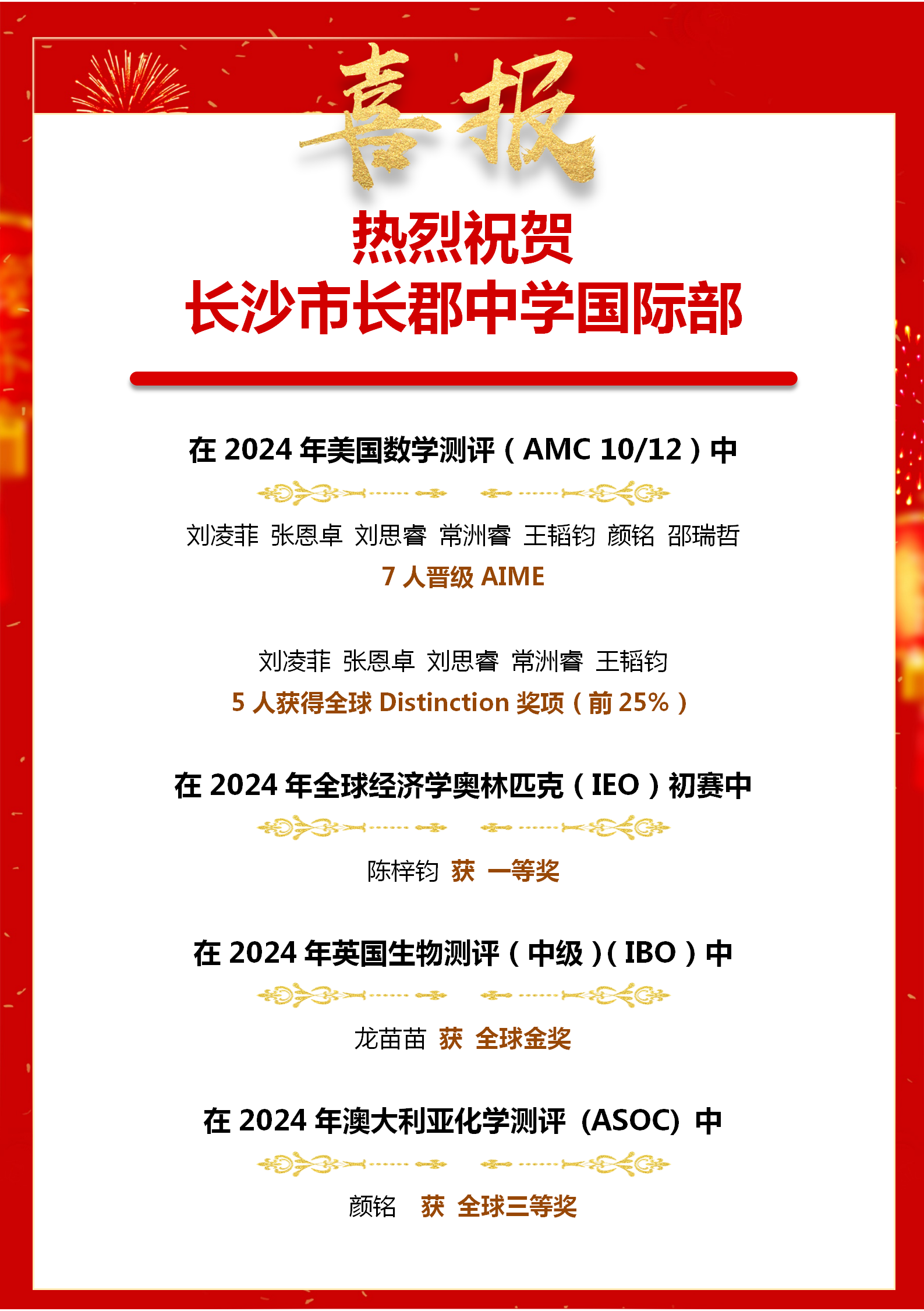 国际竞赛一直是长郡国际部体系的重要组成部分。参加国际竞赛,不仅培养学生综合素质,拓宽国际视野,全面提升科研及综合能力,也为学生申请名校增加砝码!近日,又一批国际赛事结果出炉,长郡中学国际部学子们凭借拼搏的精神和非凡的实力,取得了优异的战绩。